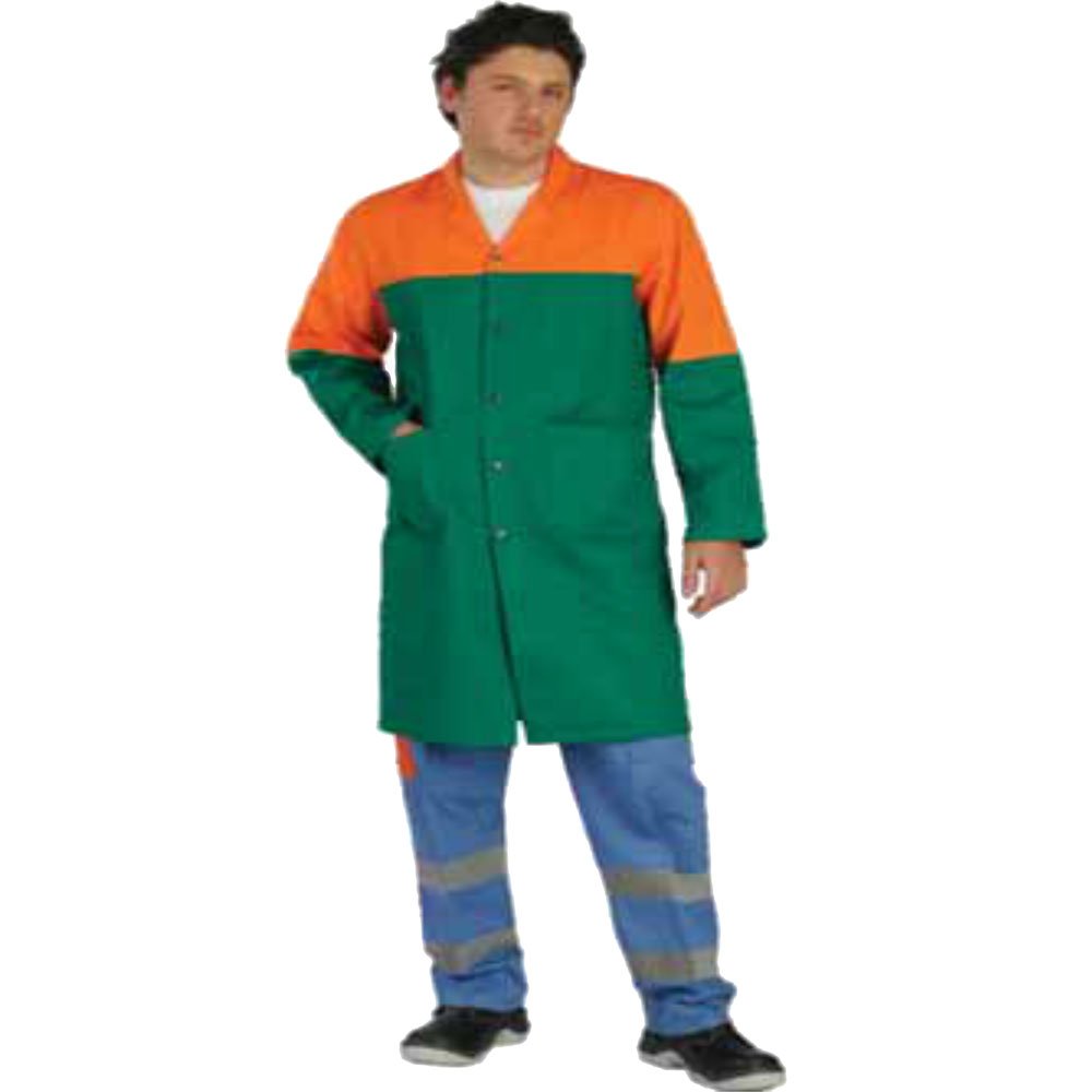 İş Önlüğü UZ 1214, canlı yeşil ve turuncu renk kombinasyonu ile iş yerlerinde profesyonel ve dinamik bir görünüm sağlar. 16/12 ve 7/7 gabardin kumaş ile alpaka kumaş seçenekleri sayesinde uzun ömürlü ve dayanıklı bir kullanım sunar. Ergonomik tasarımı ile çalışanların rahat hareket etmesini sağlarken, geniş cep tasarımları işlevselliği artırır.