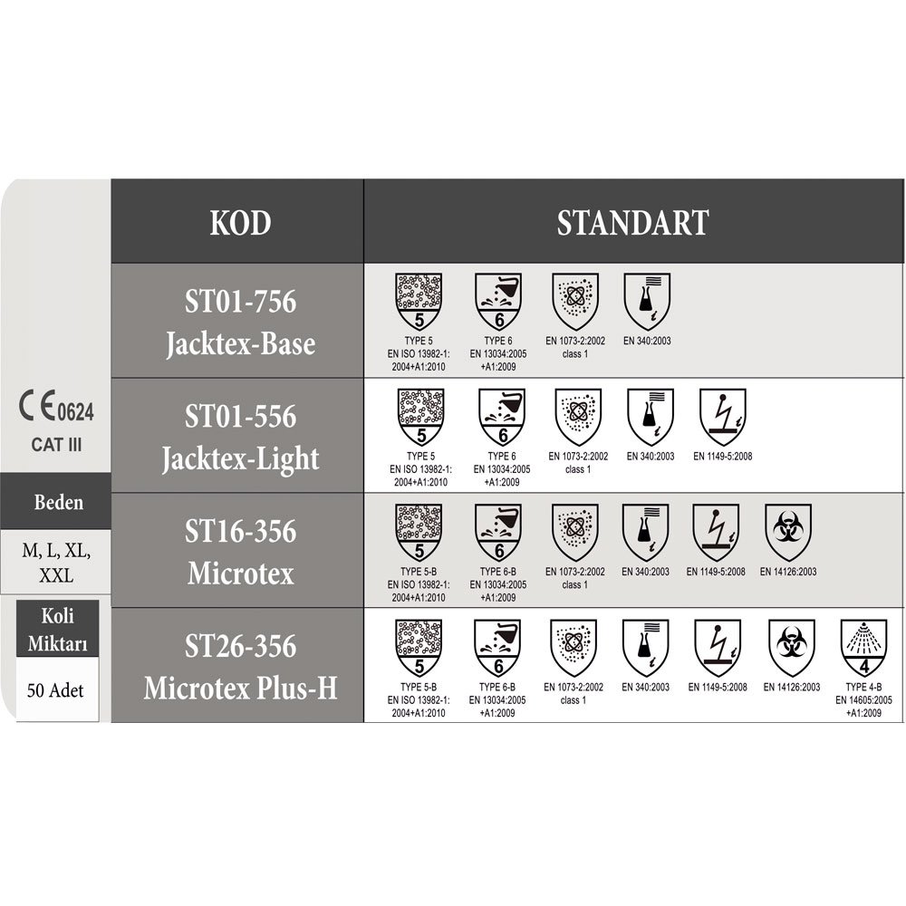 Kimyasal Önleyici Tulum; Bu tulum kullanıcıyı tehlikeli maddeler ve potansiyel kirlenmelerden koruma amaçlı üretilmiştir. Sıvı kimyasallardan ve havadaki partiküllerden korur. Dikiş yerleri kaynak yöntemi ile kapatılarak tam sızdırmazlık sağlanmıştır.